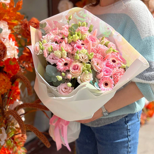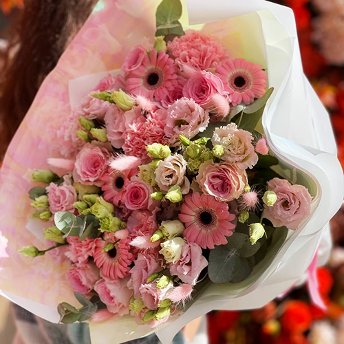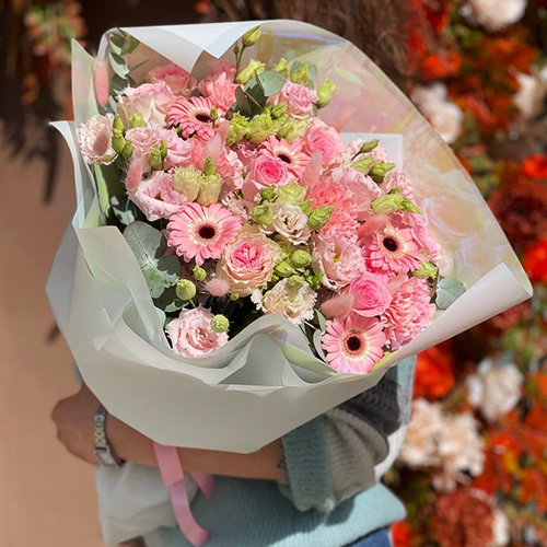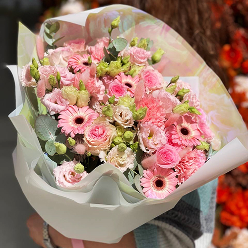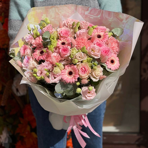 Букет "Мадрид" из гербер, эустом, роз и диантусов