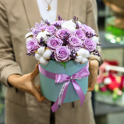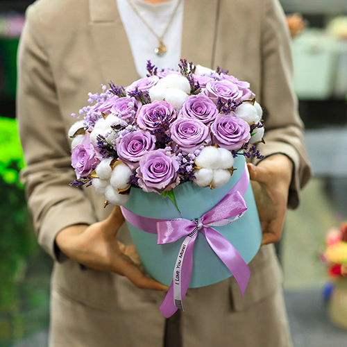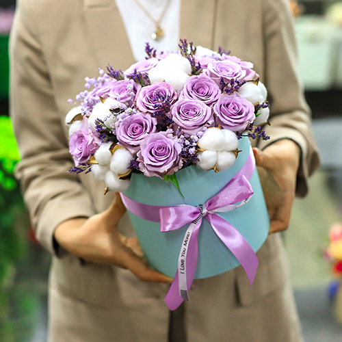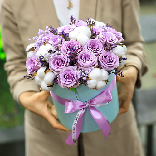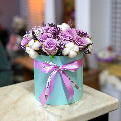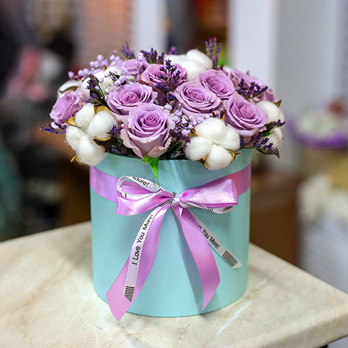 Композиция в шляпной коробке из лиловых роз Меритим, гипсофил и хлопка