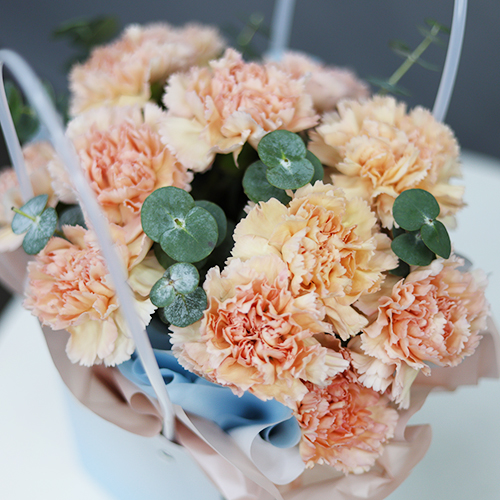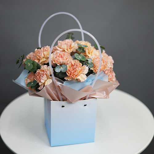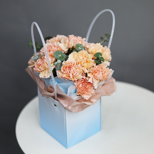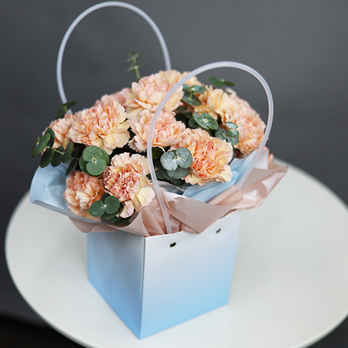 Стильная композиция в сумочке из диантусов и эвкалипта